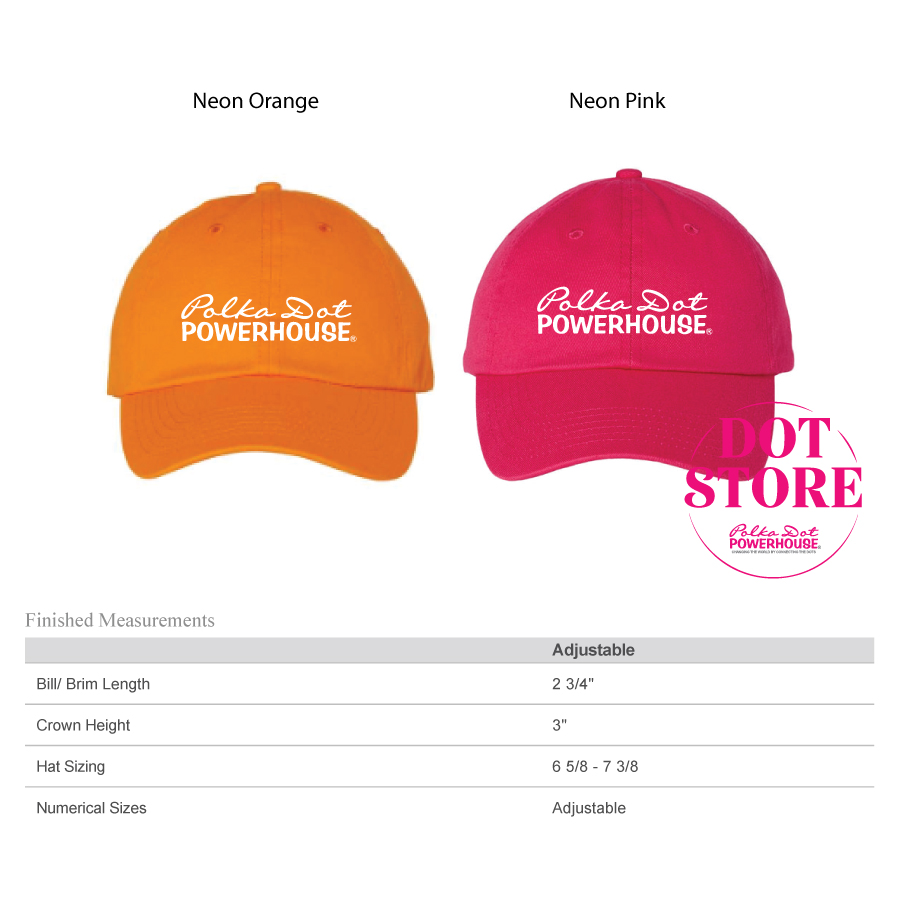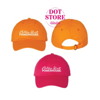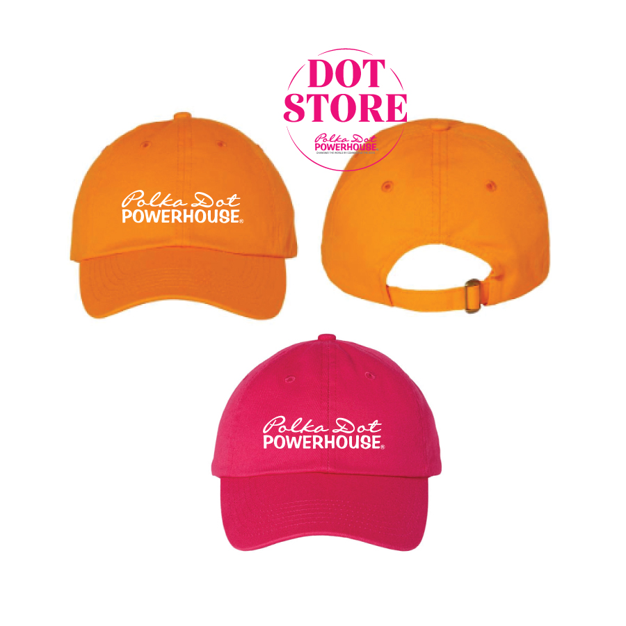Check out these cute pink and orange ball caps, branded with the Polka Dot Powerhouse logo. 100A% Co..