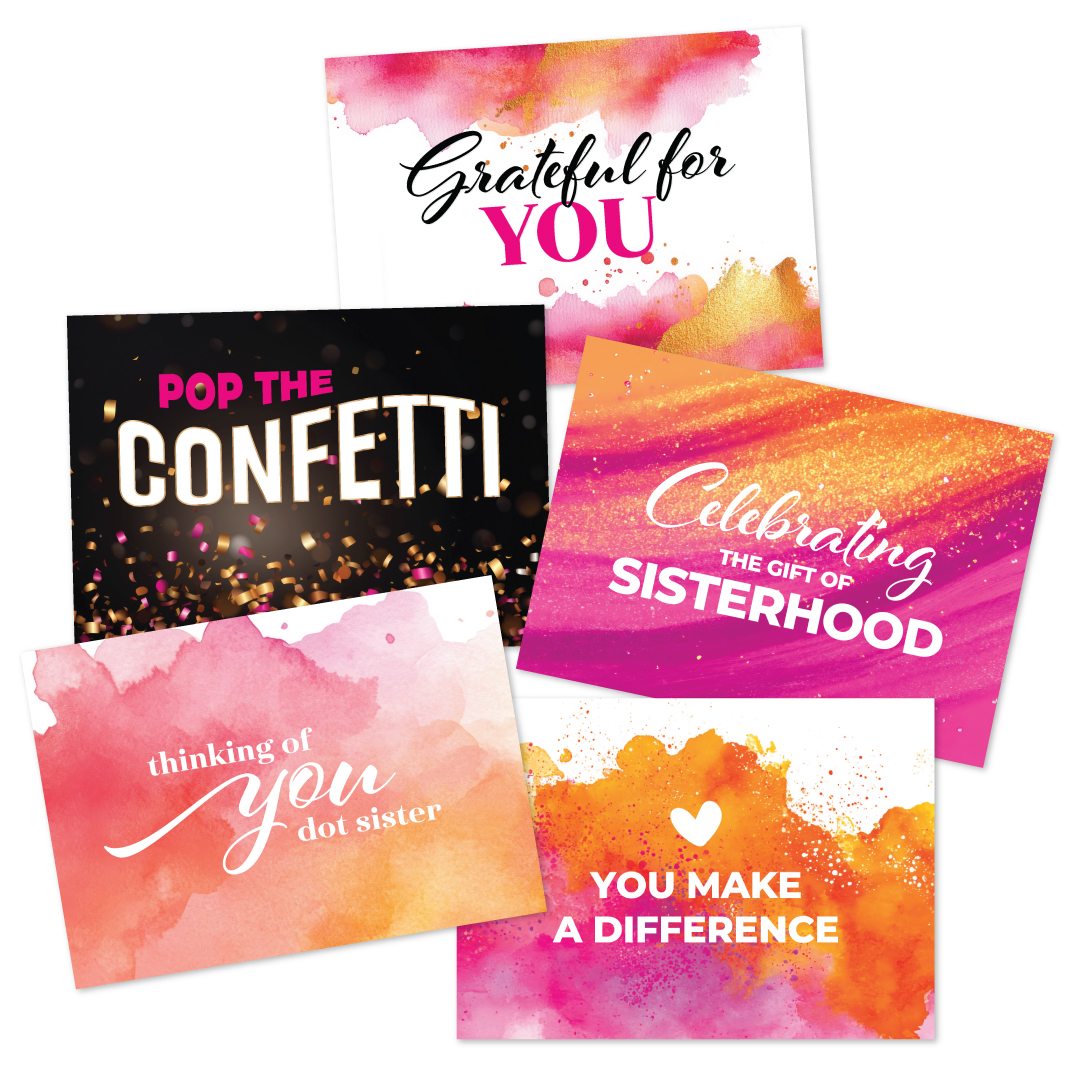 A variety pack of 5 5x7 folded blank cards with envelopes to send to other Dot sisters.